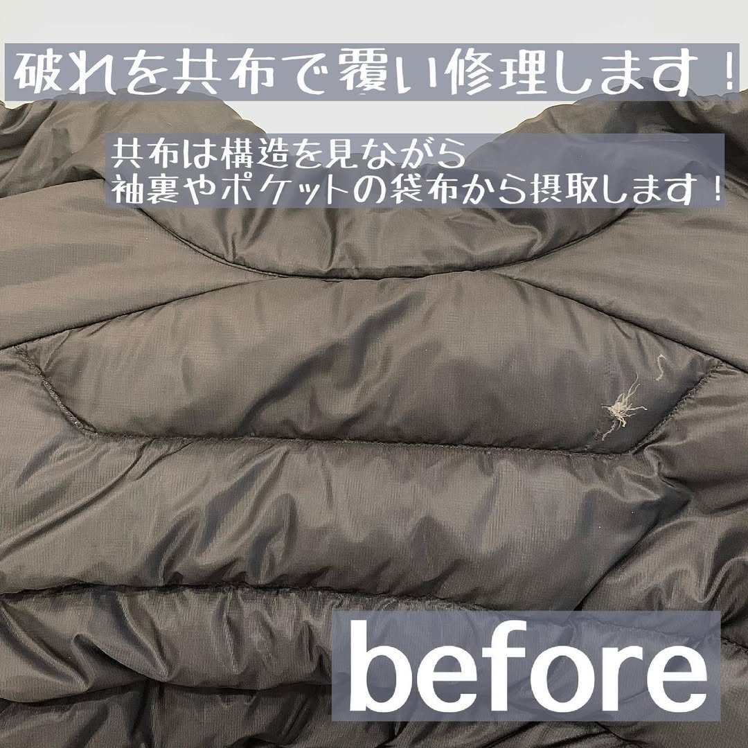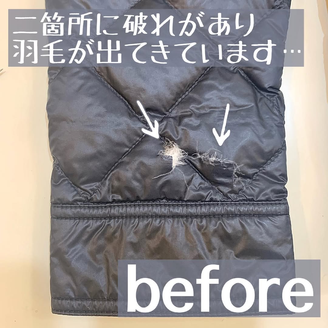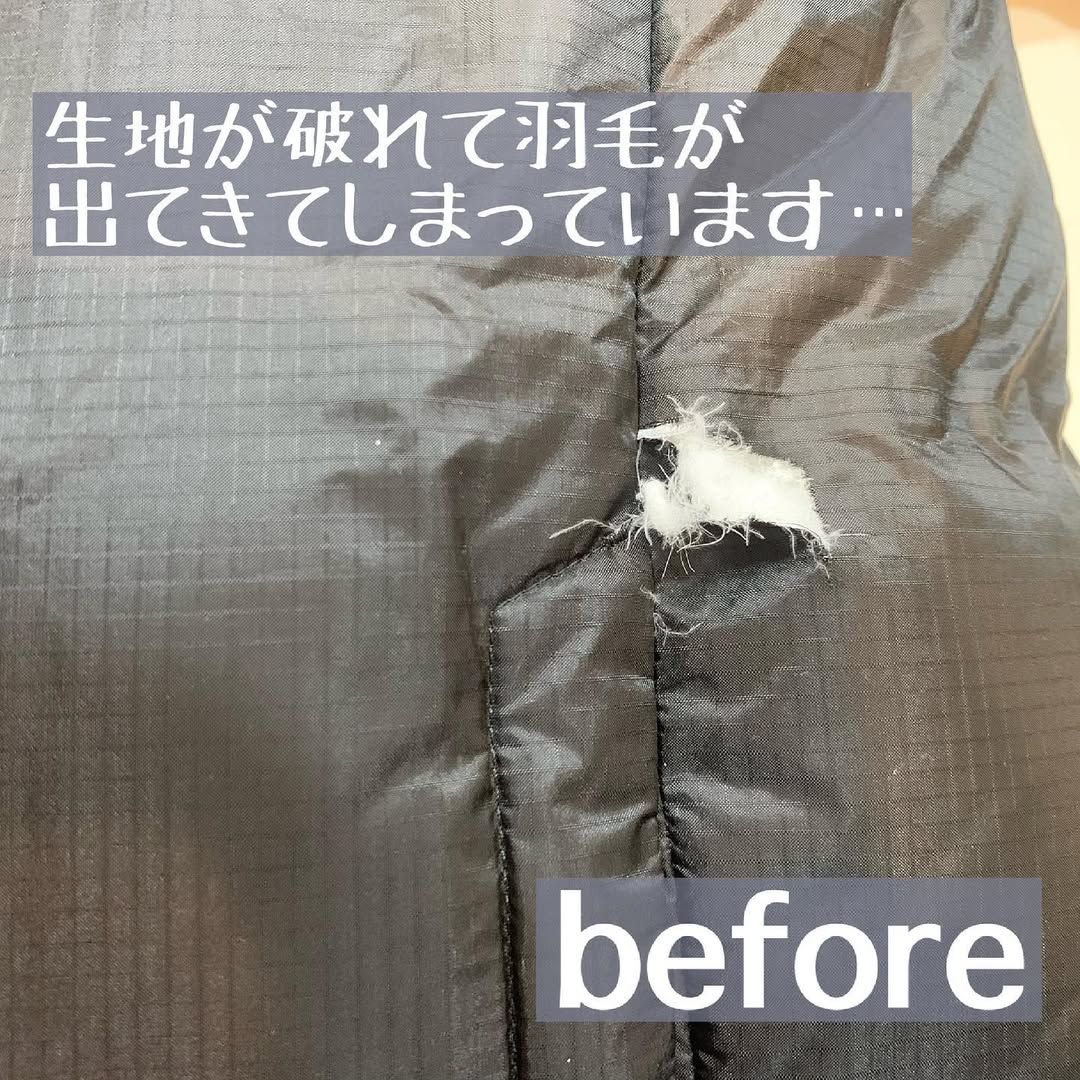 ダウン破れ・穴あき修理が不可の場合:一部特殊なダウンについてはファスナー交換が不可の場合があります。